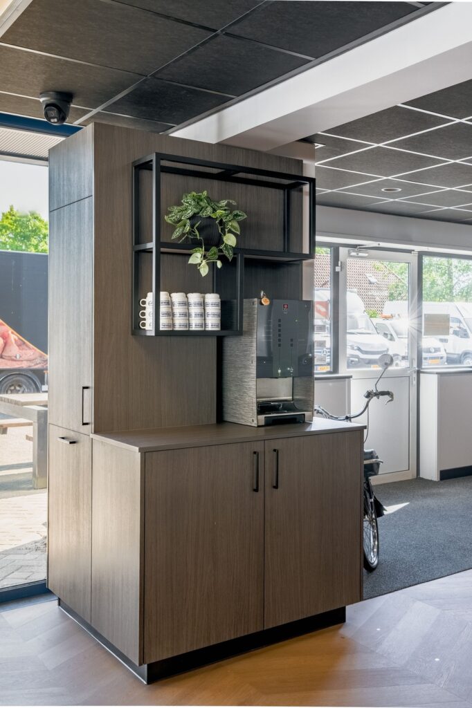 De ontvangstruimte kreeg een moderne, strakke uitstraling. De op maat gemaakte receptiebalie vormt het middelpunt, met ingebouwde ledverlichting bij het logo als stijlvol detail dat direct de aandacht trekt. De praktische koffiecorner biedt een gastvrije plek voor zowel medewerkers als bezoekers.